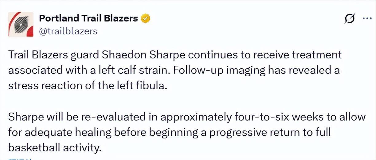 北京时间2月25日,开拓者官方更新伤病报告,后卫谢登-夏普仍在接受左侧小腿拉伤的相关治疗。复查影像显示,他出现了左侧腓骨应力性反应。夏普将在约4–6周后接受重新评估,以确保伤势充分愈合,之后再逐步恢复完整的篮球训练与比赛。